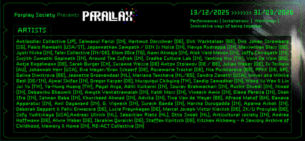 Antibodies Collective (JP), Salmanul Farizi (IN), Hartmut Dorschner (DE), Dirk Wachtelaer (BE), Dirk Johan Stromberg (SG), Fabio Rambelli (USA/IT), Jagannathan Sampath / DIN Is Noise (IN), Andreas Ullrich (DE), Sebastian Rietz (DE), Navya Rudrappa (IN), Maximilian Glass (DE), Otto Snoek (NL), Andrea Hoffmann (DE), Alwin Weber (DE), Ibrahim Quraishi (DE), Steffen Koritsch (DE), Jyoti Nisha (IN), Tales Collective (IN/DE), Elom 20ce (TG), Aami Atmaja (IN), Alok Vaid Menon (IN), Joffy Chirayath (IN), Surjith Sumathi Gopinath (IN), Around The Sufrah (IN), Sradha Culture Lab (IN), Yenting Hsu (TW), Voin De Voin (BG), Antje Engelmann (DE), Sarah Burger (CH), Susanne Weisse (DE) Anton Stoianov (DE / BE), Julian Weber (DE), Iv Toshain (AU), Johannah Herr (USA), Eva Meyer/Eran Schaerf (DE), Rosemarie Trockel (DE), Nia Pushkarova (BE), PPKK (DE, GR), Galina Dimitrova (BE), Jeanette Groenendaal (NL), Mariana Tancheva (NL/BG), Sandra Zanetti (USA), knives aka Mihika Bedi (DE/IN), Ajmal Shifaz (IN), Gregor Kasper (DE), Musquiqui Chihying (TW), Sandip Samadhar (IN), Wang Yu Wen & Lin Jui Yu (TW), Ya-Nung Huang (TW), Payal Arya, Aditi Kulkarni (IN), Sourav Brahmachari (IN), Ruchir Diwedi (IN), Ninad (IN), Debanshu Bhaumik (IN), Amyth Venkatramaiah (IN), Kaldi Moss (IN), Vineesh Amin (IN), Elena Pereira (IN), Shah Ifra (IN), Salman Baba (IN), Khursheed Ahmad (IN), Advika (IN), Tina Van de Weyer (BE), Afrane Makof (GH), Banana Apparatus (IN), Anil Dayanand (IN), G. Vignesh (IN), Suresh Banda (IN), Harsha Durugadda (IN), Aparna Ashok (IN), Deborah Geppert & Felix Ermacora (DE), Lucie Freynhagen (DE), Marcel Joseph Victor Kieslich (DE), ZK/U Proxylab (DE), Sofy Yuditskaya (USA), Kitchen Alchemy – A Sensory Archive of Childhood, Memory & Home (IN), RE-ACT Collective (IN)